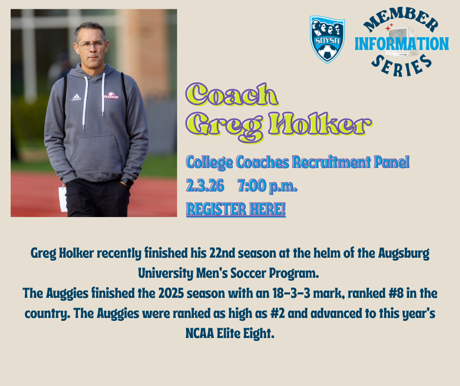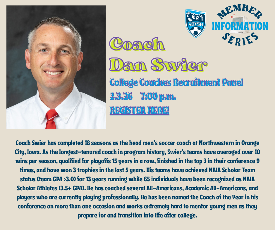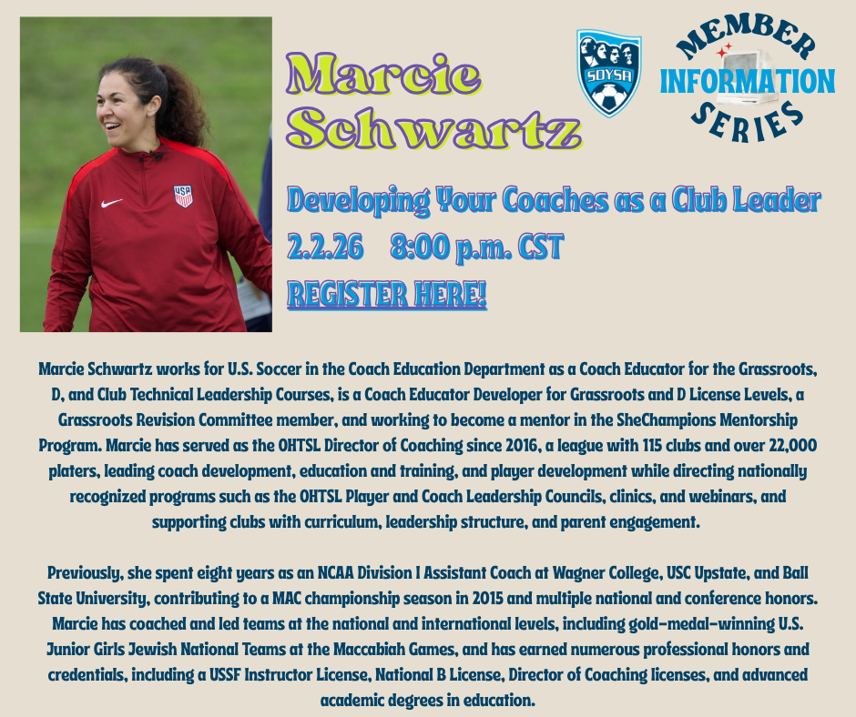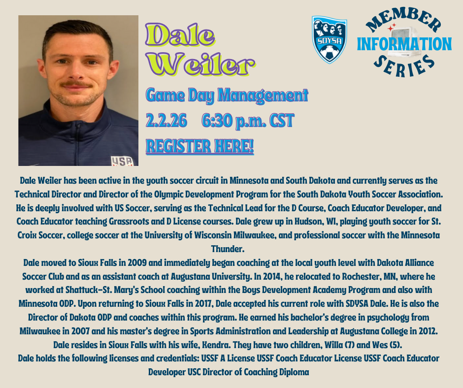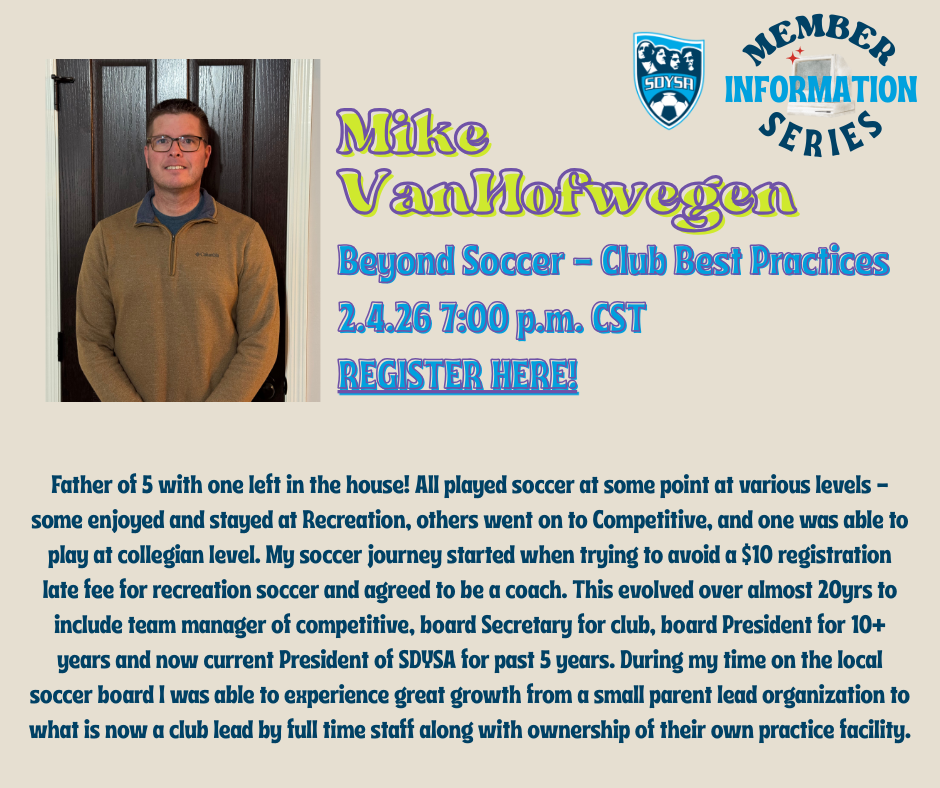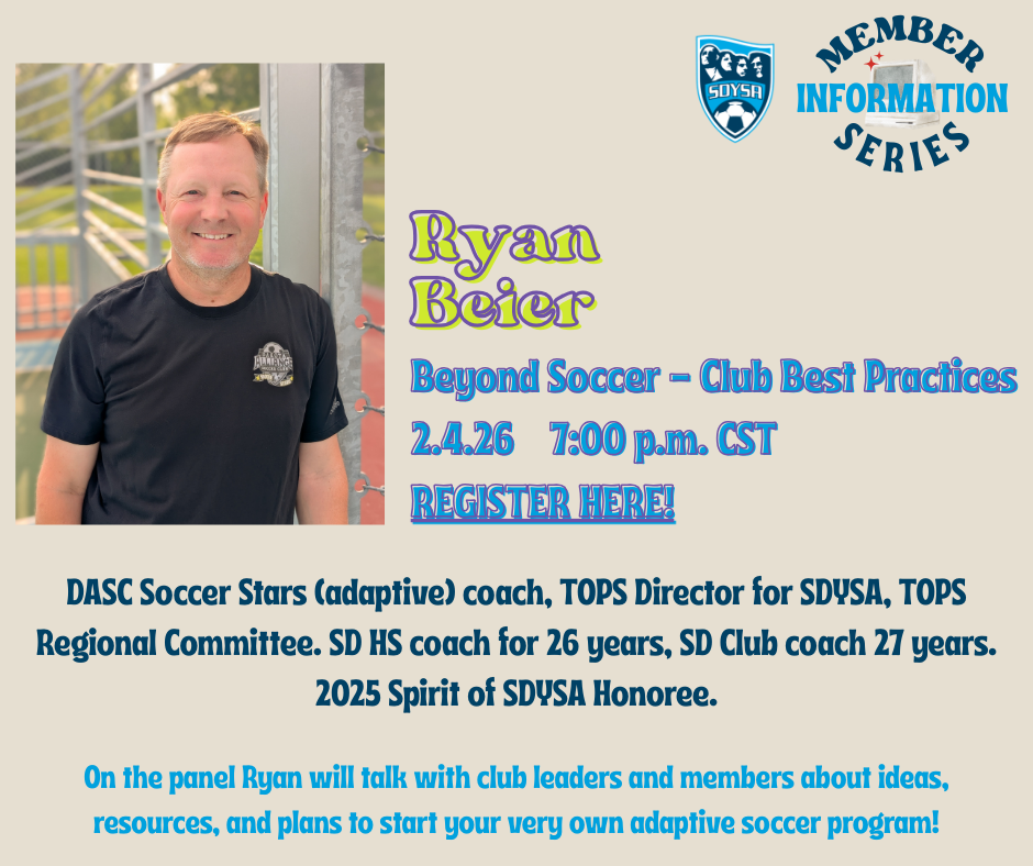 On Wednesday, February 4th at 7:00 p.m. CST we will have another phenomenal panel of SDYSA board members & program managers for our club leaders to hear from. Ryan Beier will be discussing TOPSoccer Adaptive Soccer programming for your communities, Katie and Mike will be discussing some essential club best practices as it relates to risk management, fundraising, and more. Club leaders -don’t miss this!